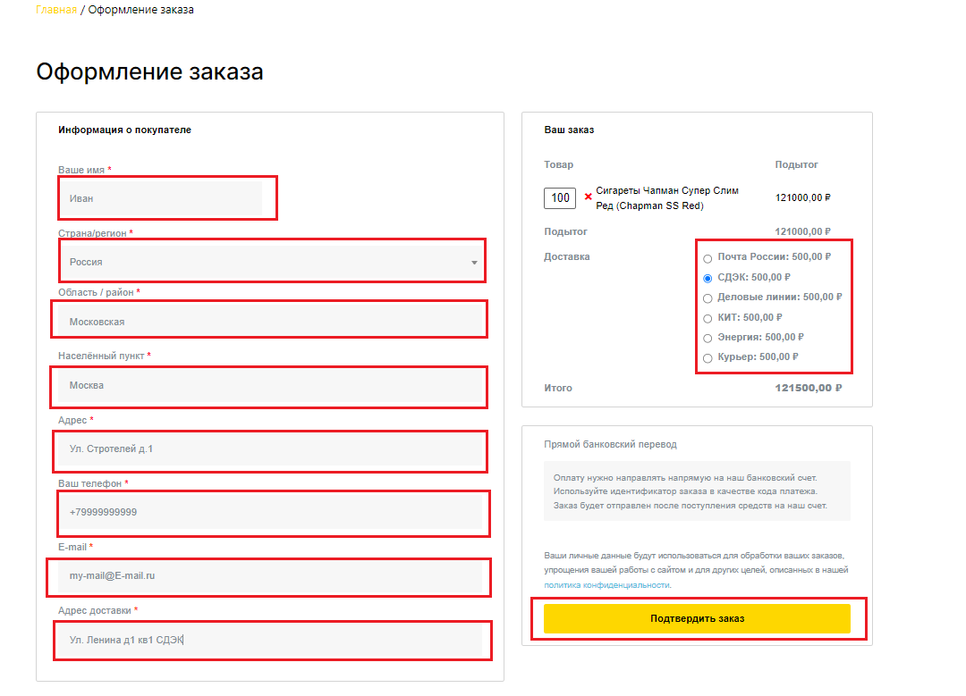 5. Оформляем заказ. Обратите внимание что обязательные для заполнения поля выделены красной звездочкой. Так же обязательно выберите нужный способ доставки заказа. После того как вы заполнели данных, обязательно проверьте их) Указывайте Ваш действующий номер телефона и почту (туда будет поступать информация о движении вашего заказа).