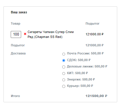 Вот так вы сделали заказ на 5 блоков Чапман Супер Слим Ред. Обработка заказов происходит в течение 2-3 часов, после Ваш заказ автоматически попадает на склад для сборки и дальнейшей доставки в транспортную компанию которую вы выбрали при оформлении заказа.