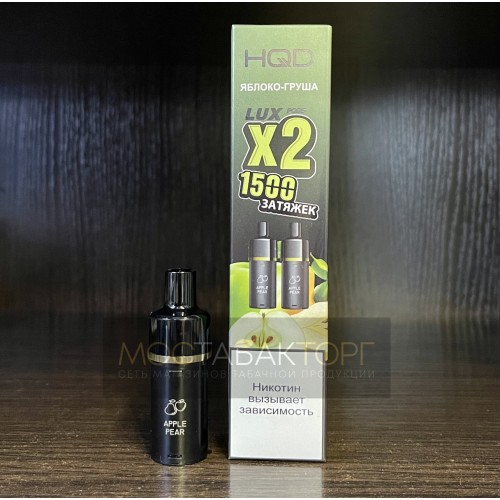 Картриджи HQD LUX Яблоко Груша. В упаковке 2 картриджа на 1500 затяжек каждый.