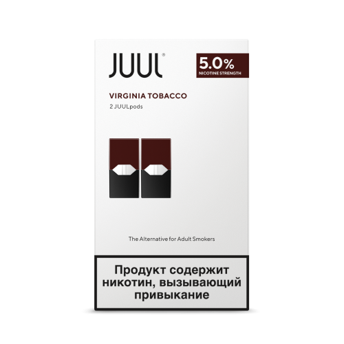 Картриджи JUUL Табак Вирджиния — со вкусом табака сорта Вирджинии. Один под (картридж) расчитан на ~200 затяжек и эквивалентен одной пачке сигарет. Поды (картриджи) доступны в упаковках по 2 и 4шт., крепость никотина составляет 59 мг/мл.