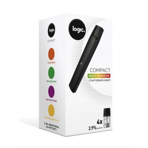 В набор входят: девайс Logic Compact чёрного цвета и четыре капсулы со вкусами (Классика 2.9, Мятный Бриз 2.9, Тропический Микс 2.9, Мятная Ягода 2.9)