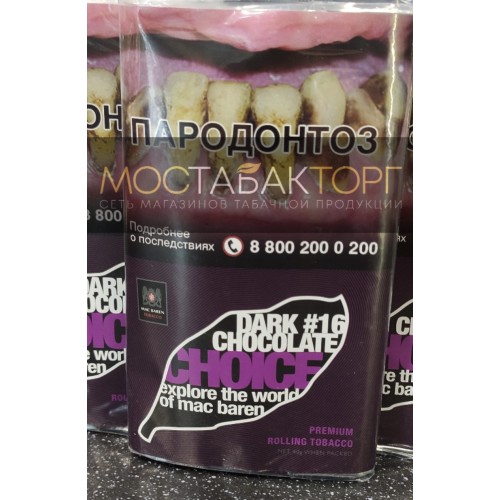 Mac Baren Dark Chocolate Choice (Мак Барен Тёмный Шоколад) табак сигаретный с насыщенным и сладковатым ароматом. Табачная смесь состоит из Вирджинии и Берлей. Тонкая нарезка табака способствует легкому «забитию» сигарет и мягкому курению. Табак средней крепости.